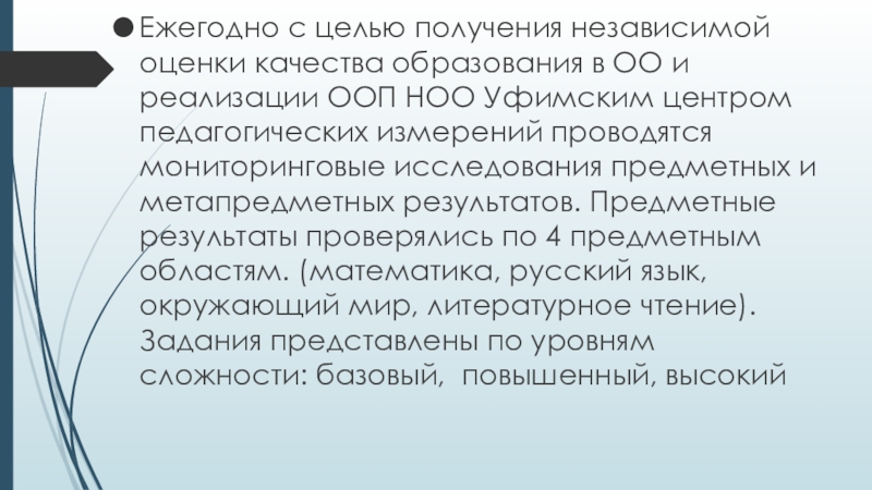 реализации ООП НОО Уфимским центром педагогических измерений проводятся мониторинговые исследования предметных и метапредметных результатов. Предметные результаты проверялись по 4 предметным областям. (математика, русский язык, окружающий мир, литературное чтение). Задания представлены по уровням сложности: базовый, повышенный, высокий