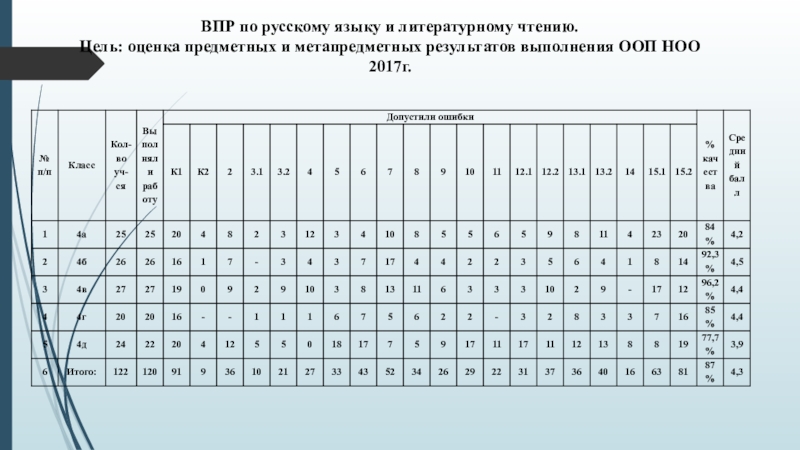 Цель: оценка предметных и метапредметных результатов выполнения ООП НОО.2017г.