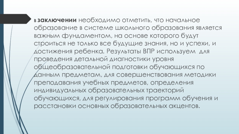 является важным фундаментом, на основе которого будут строиться не только все будущие знания, но и успехи, и достижения ребенка. Результаты ВПР используем для проведения детальной диагностики уровня общеобразовательной подготовки обучающихся по данным предметам, для совершенствования методики преподавания учебных предметов, определения индивидуальных образовательных траекторий обучающихся, для регулирования программ обучения и расстановки основных образовательных акцентов.