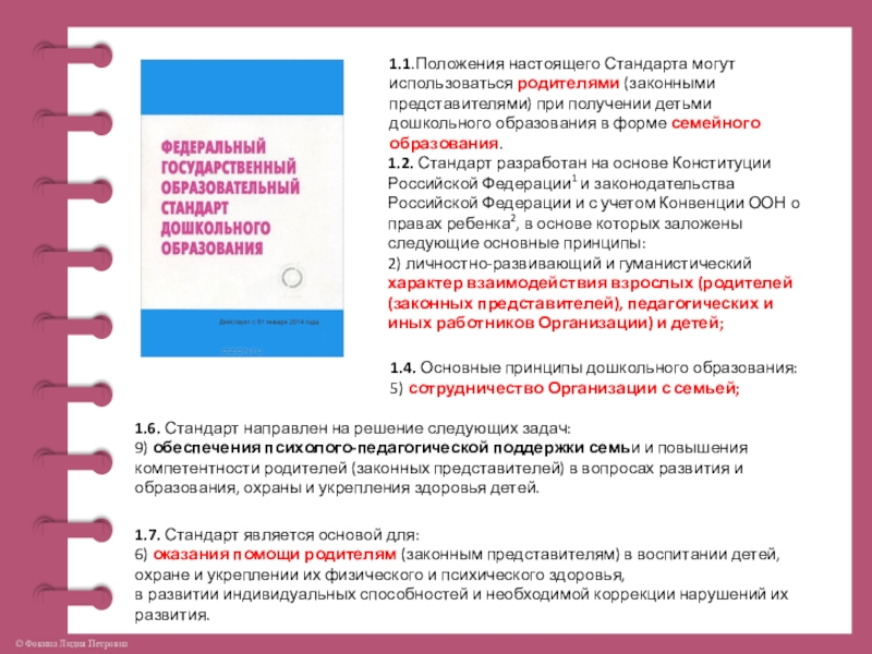 1.2. Стандарт разработан на основе Конституции Российской Федерации1 и законодательства Российской Федерации и с учетом Конвенции ООН о правах ребенка2, в основе которых заложены следующие основные принципы: