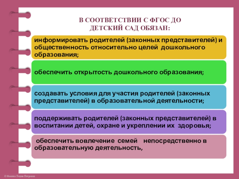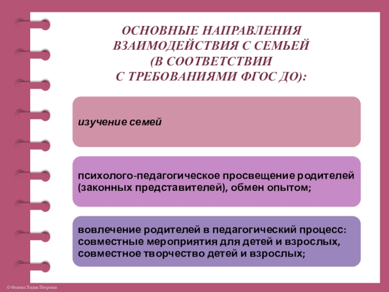 8) поддержка родителей (законных представителей) в воспитании детей, охране и укреплении их здоровья, вовлечение семей непосредственно в образовательную деятельность.