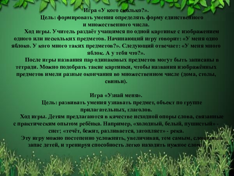 Ход игры. Учитель раздаёт учащимся по одной картинке с изображением одного или нескольких предметов. Начинающий игру говорит: «У меня одно яблоко. У кого много таких предметов?». Следующий отвечает: «У меня много яблок. А у тебя что?».