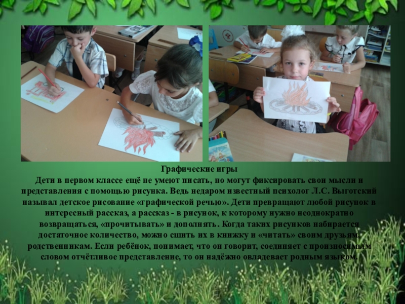 фиксировать свои мысли и представления с помощью рисунка. Ведь недаром известный психолог Л.С. Выготский называл детское рисование «графической речью». Дети превращают любой рисунок в интересный рассказ, а рассказ - в рисунок, к которому нужно неоднократно возвращаться, «прочитывать» и дополнять. Когда таких рисунков набирается достаточное количество, можно сшить их в книжку и «читать» своим друзьям, родственникам. Если ребёнок, понимает, что он говорит, соединяет с произносимым словом отчётливое представление, то он надёжно овладевает родным языком.