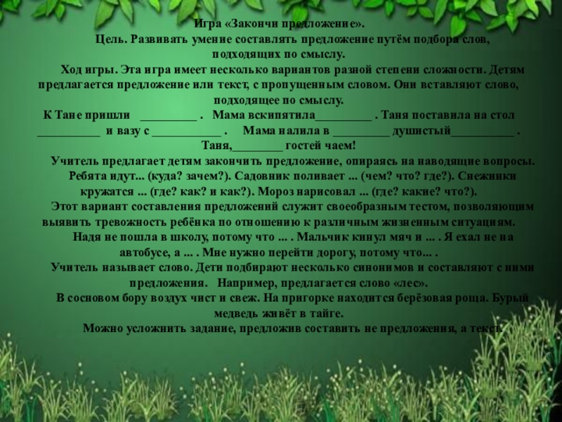 Ход игры. Эта игра имеет несколько вариантов разной степени сложности. Детям предлагается предложение или текст, с пропущенным словом. Они вставляют слово, подходящее по смыслу.