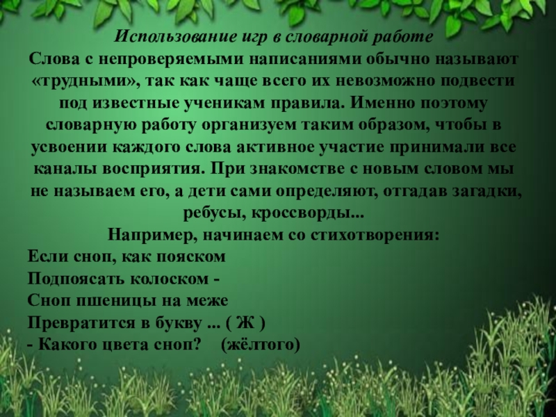 так как чаще всего их невозможно подвести под известные ученикам правила. Именно поэтому словарную работу организуем таким образом, чтобы в усвоении каждого слова активное участие принимали все каналы восприятия. При знакомстве с новым словом мы не называем его, а дети сами определяют, отгадав загадки, ребусы, кроссворды...