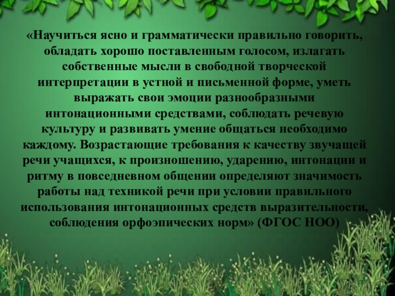 собственные мысли в свободной творческой интерпретации в устной и письменной форме, уметь выражать свои эмоции разнообразными интонационными средствами, соблюдать речевую культуру и развивать умение общаться необходимо каждому. Возрастающие требования к качеству звучащей речи учащихся, к произношению, ударению, интонации и ритму в повседневном общении определяют значимость работы над техникой речи при условии правильного использования интонационных средств выразительности, соблюдения орфоэпических норм» (ФГОС НОО)
