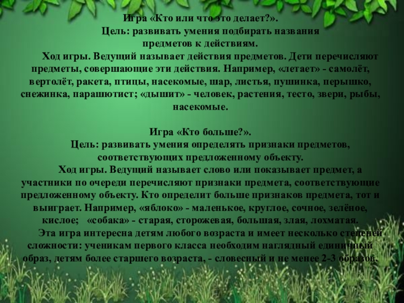 Ход игры. Ведущий называет действия предметов. Дети перечисляют предметы, совершающие эти действия. Например, «летает» - самолёт, вертолёт, ракета, птицы, насекомые, шар, листья, пушинка, перышко, снежинка, парашютист; «дышит» - человек, растения, тесто, звери, рыбы, насекомые.