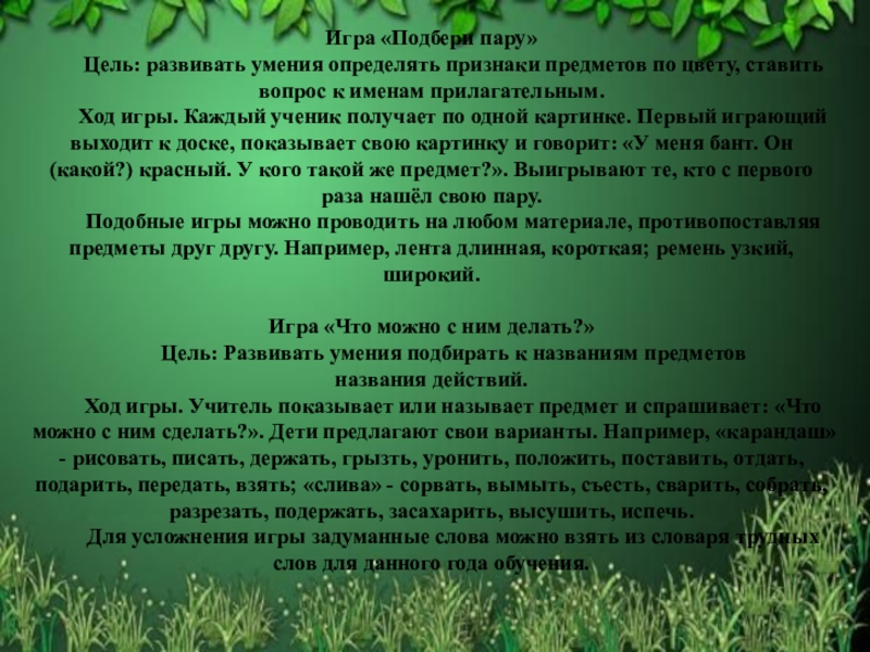 Ход игры. Учитель показывает или называет предмет и спрашивает: «Что можно с ним сделать?». Дети предлагают свои варианты. Например, «карандаш» - рисовать, писать, держать, грызть, уронить, положить, поставить, отдать, подарить, передать, взять; «слива» - сорвать, вымыть, съесть, сварить, собрать, разрезать, подержать, засахарить, высушить, испечь.