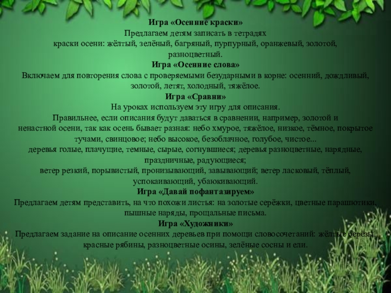 мы убедились, что, во - первых, прежде чем дать задание ученикам на создание или восприятие высказывания, необходимо, обеспечить возникновение у них соответствующей потребности, желания вступить в речевое общение, а, во - вторых, предложить детям создать такой текст, который обеспечивал бы им понимание того, к кому, зачем и при каких обстоятельствах они обращаются. Подготовку к написанию сочинений начинаем за 2 недели. Приводим несколько примеров подготовительной работы по теме «Осень» с включением игр.