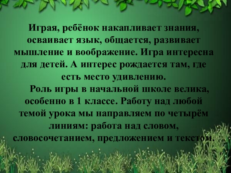 Роль игры в начальной школе велика, особенно в 1 классе. Работу над любой темой урока мы направляем по четырём линиям: работа над словом, словосочетанием, предложением и текстом.