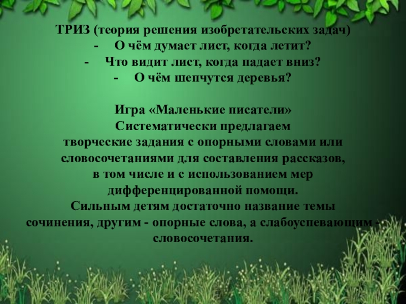 сочинения, другим - опорные слова, а слабоуспевающим - словосочетания.