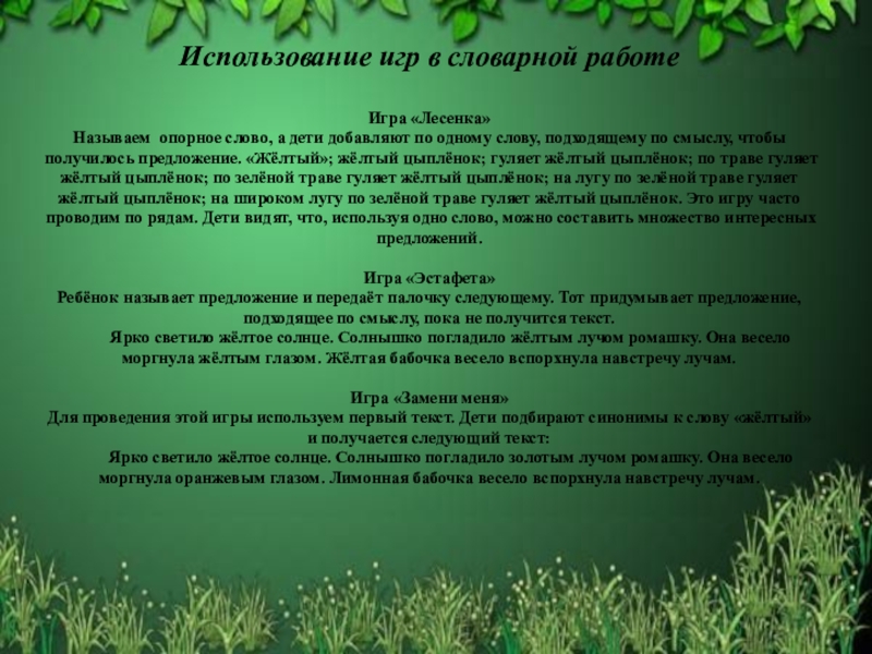добавляют по одному слову, подходящему по смыслу, чтобы получилось предложение. «Жёлтый»; жёлтый цыплёнок; гуляет жёлтый цыплёнок; по траве гуляет жёлтый цыплёнок; по зелёной траве гуляет жёлтый цыплёнок; на лугу по зелёной траве гуляет жёлтый цыплёнок; на широком лугу по зелёной траве гуляет жёлтый цыплёнок. Это игру часто проводим по рядам. Дети видят, что, используя одно слово, можно составить множество интересных предложений.