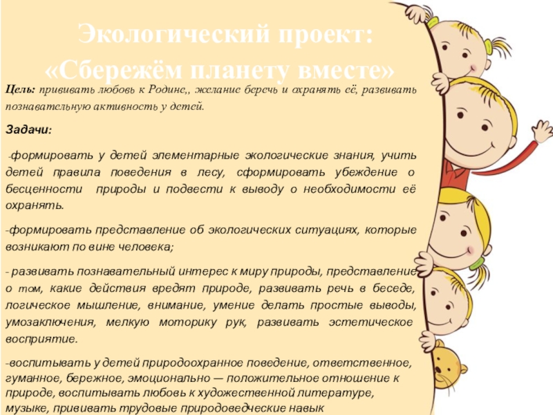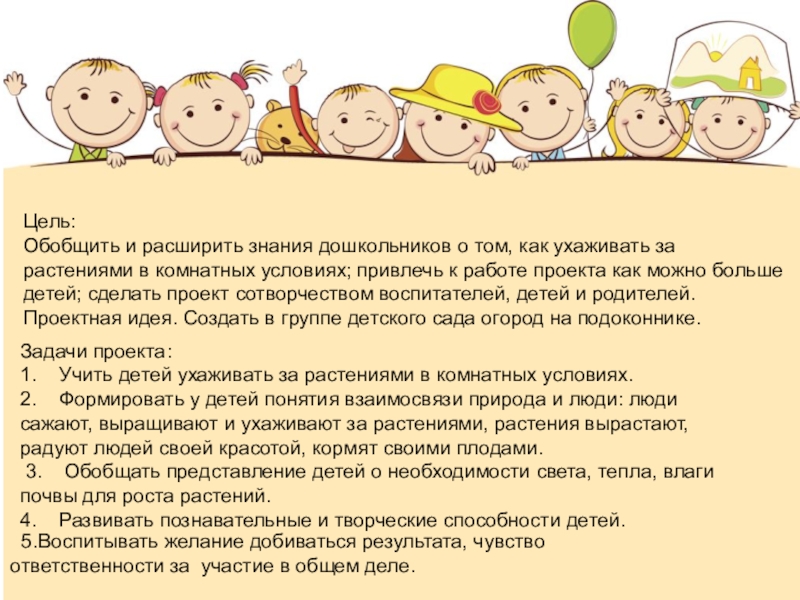 за растениями в комнатных условиях; привлечь к работе проекта как можно больше детей; сделать проект сотворчеством воспитателей, детей и родителей.