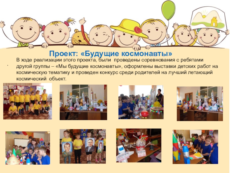 с ребятами другой группы – «Мы будущие космонавты», оформлены выставки детских работ на космическую тематику и проведен конкурс среди родителей на лучший летающий космический объект.