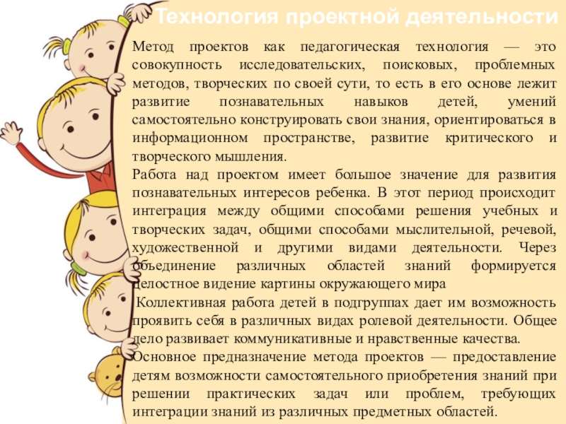Основное предназначение метода проектов — предоставление детям возможности самостоятельного приобретения знаний при решении практических задач или проблем, требующих интеграции знаний из различных предметных областей.