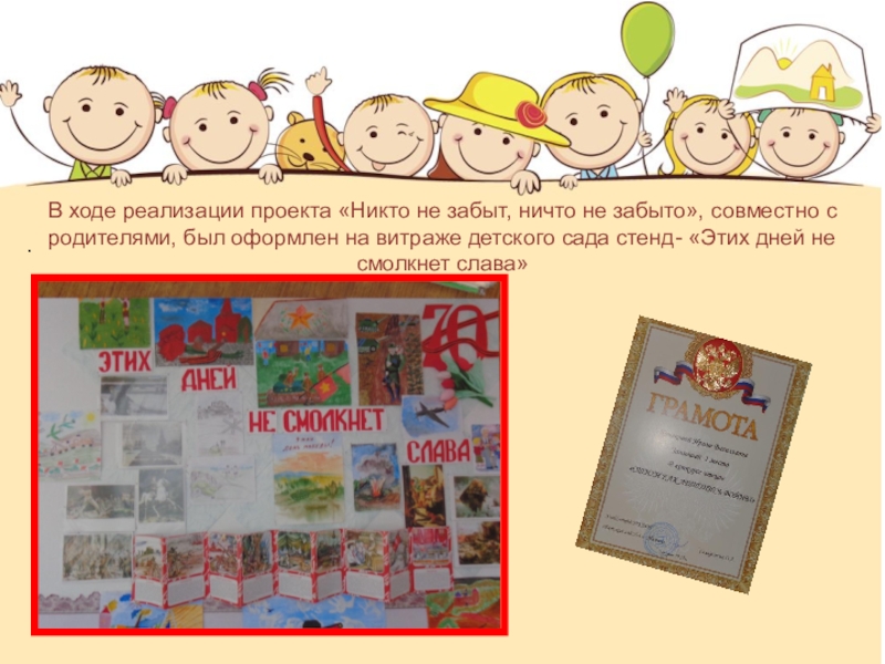 совместно с родителями, был оформлен на витраже детского сада стенд- «Этих дней не смолкнет слава»