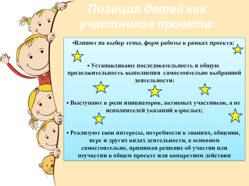 Выступают в роли инициаторов, активных участников, а не исполнителей указаний взрослых;