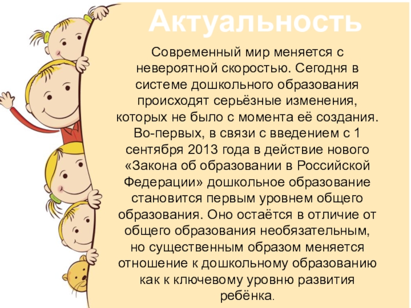Во-первых, в связи с введением с 1 сентября 2013 года в действие нового «Закона об образовании в Российской Федерации» дошкольное образование становится первым уровнем общего образования. Оно остаётся в отличие от общего образования необязательным, но существенным образом меняется отношение к дошкольному образованию как к ключевому уровню развития ребёнка.