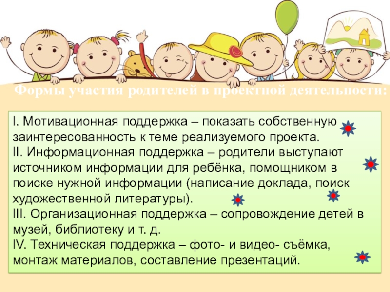 II. Информационная поддержка – родители выступают источником информации для ребёнка, помощником в поиске нужной информации (написание доклада, поиск художественной литературы).