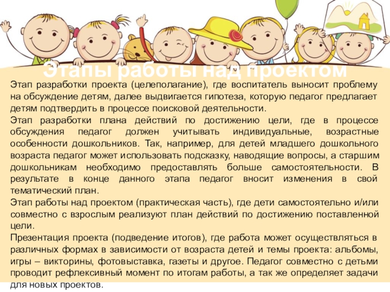 день является актуальным вопросом. Метод проекта помогает осваивать детьми окружающую действительность, активизирует самостоятельную познавательную деятельность детей, развивает их творческие способности, навык обобщать и систематизировать, а также способствует развитие психических процессов детей дошкольного возраста.