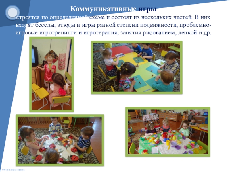частей. В них входят беседы, этюды и игры разной степени подвижности, проблемно-игровые игротренинги и игротерапия, занятия рисованием, лепкой и др.