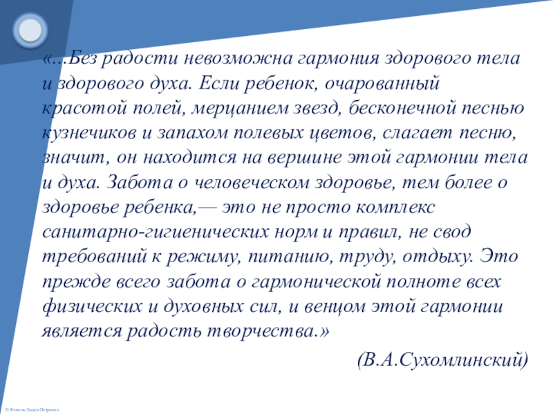 Слайд 22«...Без радости невозможна гармония здорового тела и здорового духа. Если ребенок,
