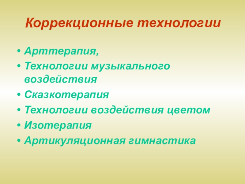 Коррекционные технологииАрттерапия,Технологии музыкального воздействияСказкотерапияТехнологии воздействия цветомИзотерапияАртикуляционная гимнастика