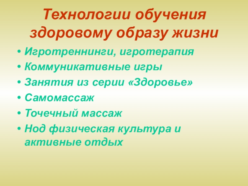 Технологии обучения здоровому образу жизниИгротреннинги, игротерапияКоммуникативные игрыЗанятия из серии «Здоровье»СамомассажТочечный массажНод физическая культура и активные отдых