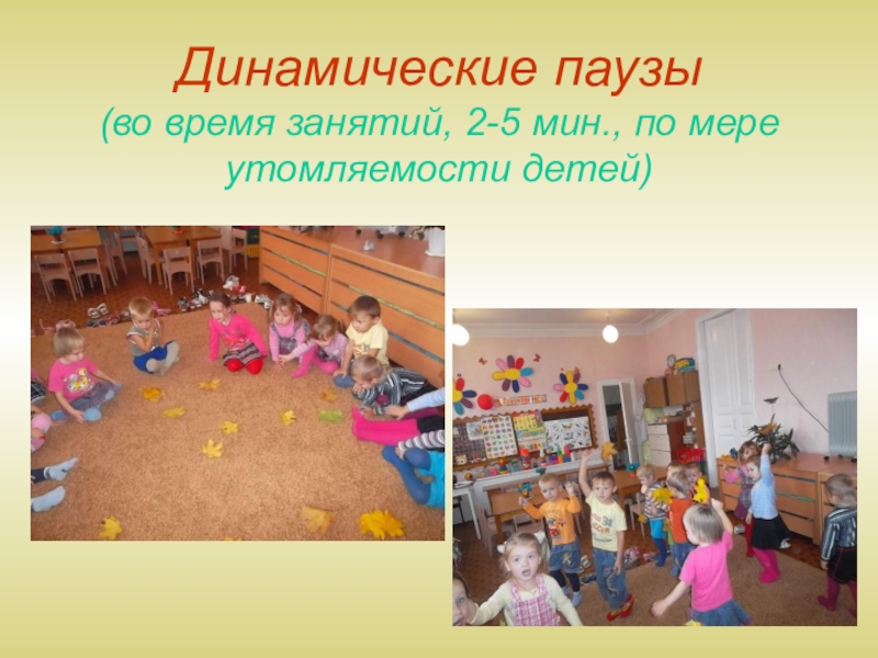 Слайд 12Динамические паузы (во время занятий, 2-5 мин., по мере утомляемости детей)