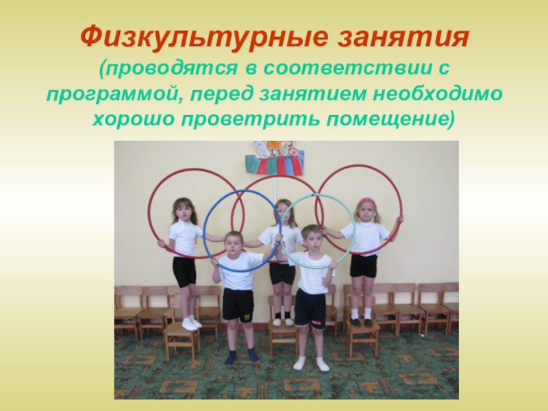 Слайд 10Физкультурные занятия (проводятся в соответствии с программой, перед занятием необходимо хорошо проветрить