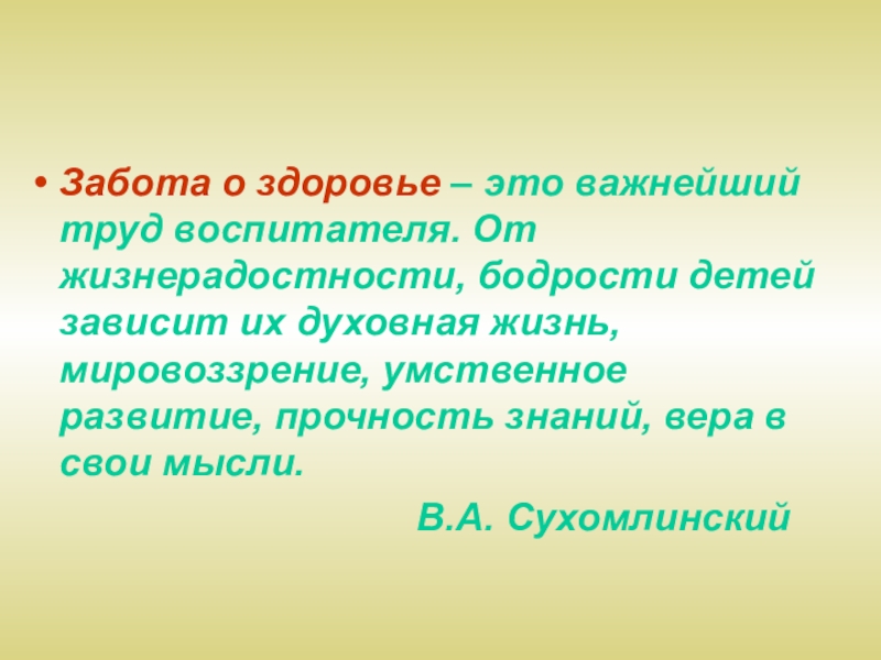 Забота о здоровье – это важнейший труд воспитателя. От жизнерадостности, бодрости детей зависит их духовная жизнь, мировоззрение, умственное развитие, прочность знаний, вера в свои мысли.