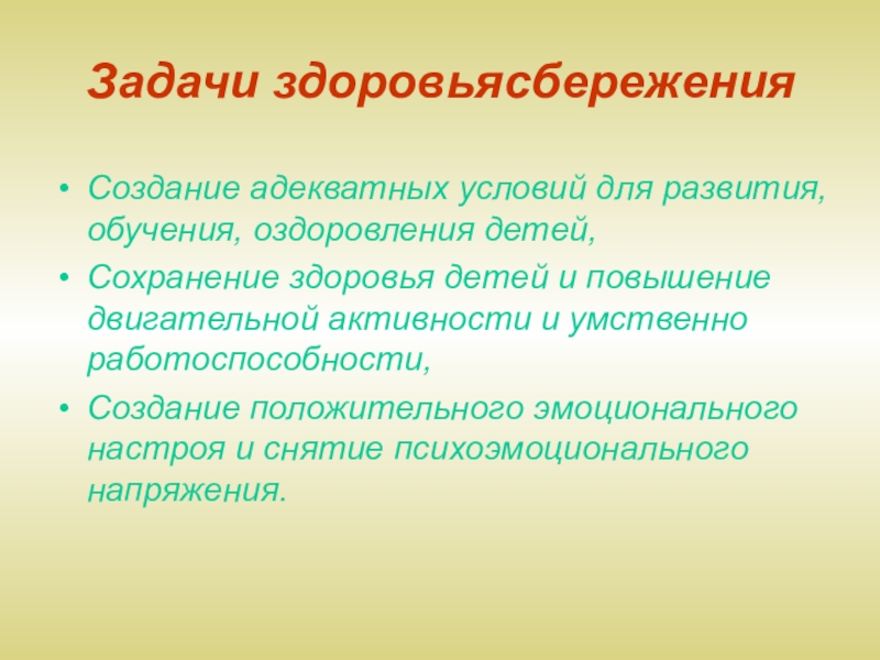 Задачи здоровьясбереженияСоздание адекватных условий для развития, обучения, оздоровления детей,Сохранение здоровья детей и повышение двигательной активности и умственно