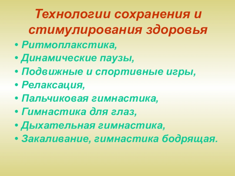 Технологии сохранения и стимулирования здоровьяРитмоплакстика, Динамические паузы, Подвижные и спортивные игры, Релаксация, Пальчиковая гимнастика, Гимнастика для глаз,