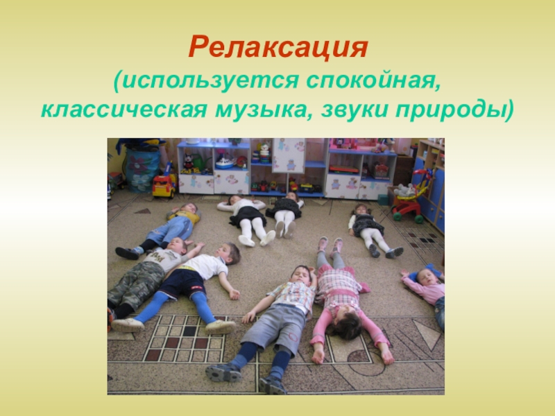 Слайд 14Релаксация (используется спокойная, классическая музыка, звуки природы)