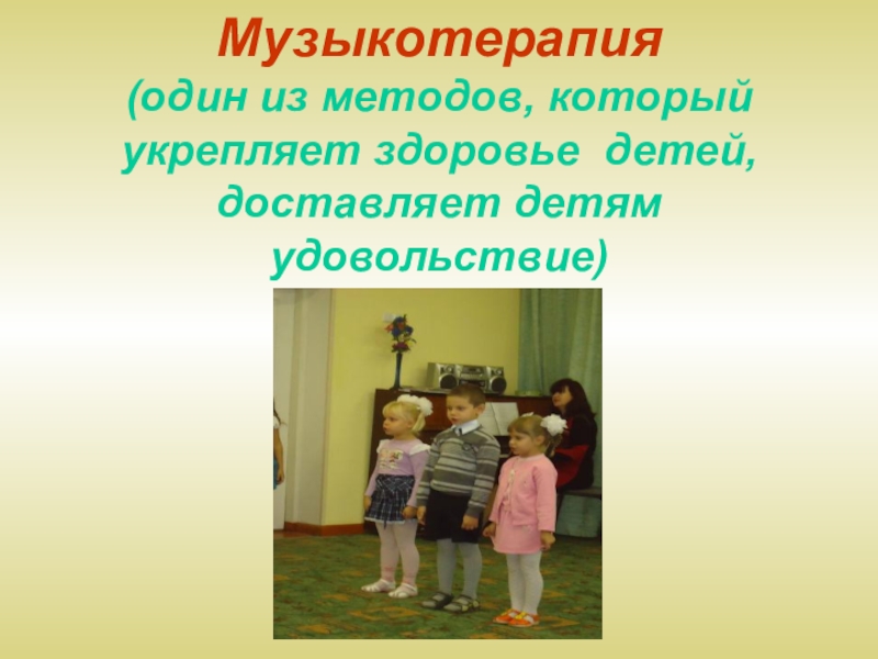 Слайд 27Музыкотерапия (один из методов, который укрепляет здоровье детей, доставляет детям удовольствие)