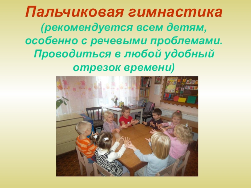 Слайд 16Пальчиковая гимнастика (рекомендуется всем детям, особенно с речевыми проблемами. Проводиться в любой