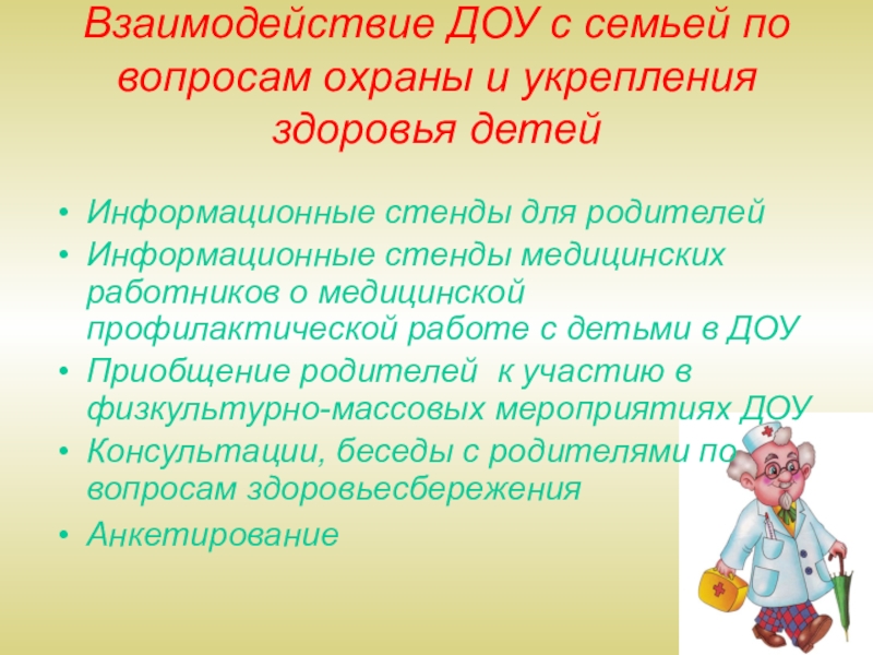 Слайд 30 Взаимодействие ДОУ с семьей по вопросам охраны и укрепления здоровья детей