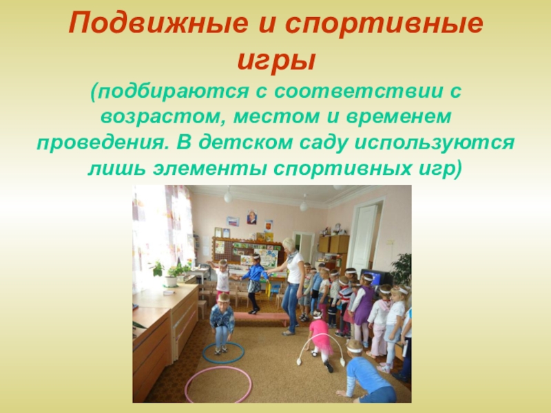 Подвижные и спортивные игры (подбираются с соответствии с возрастом, местом и временем проведения. В детском саду используются