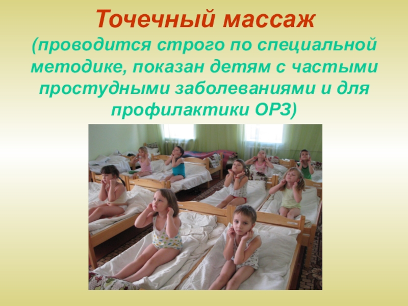 Слайд 22Точечный массаж (проводится строго по специальной методике, показан детям с частыми простудными