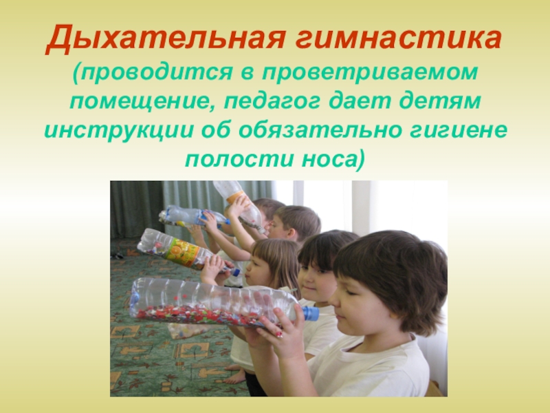 Слайд 17Дыхательная гимнастика (проводится в проветриваемом помещение, педагог дает детям инструкции об обязательно