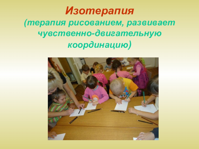 Слайд 28Изотерапия (терапия рисованием, развивает чувственно-двигательную координацию)
