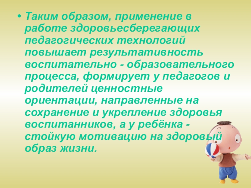 Таким образом, применение в работе здоровьесберегающих педагогических технологий повышает результативность воспитательно - образовательного процесса, формирует у педагогов