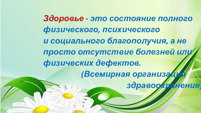 Здоровье - это состояние полногофизического, психическогои социального благополучия, а непросто отсутствие болезней илифизических дефектов.