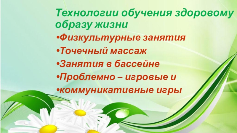 Технологии обучения здоровому образу жизниФизкультурные занятияТочечный массажЗанятия в бассейнеПроблемно – игровые икоммуникативные игры