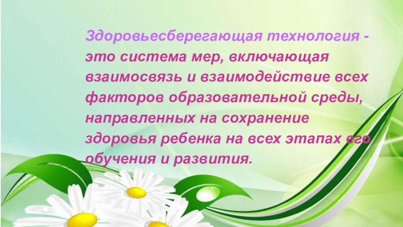 Здоровьесберегающая технология -это система мер, включающаявзаимосвязь и взаимодействие всехфакторов образовательной среды,направленных на сохранениездоровья ребенка на всех этапах