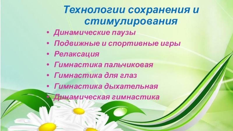 Технологии сохранения и стимулированияДинамические паузыПодвижные и спортивные игрыРелаксацияГимнастика пальчиковаяГимнастика для глазГимнастика дыхательнаяДинамическая гимнастика