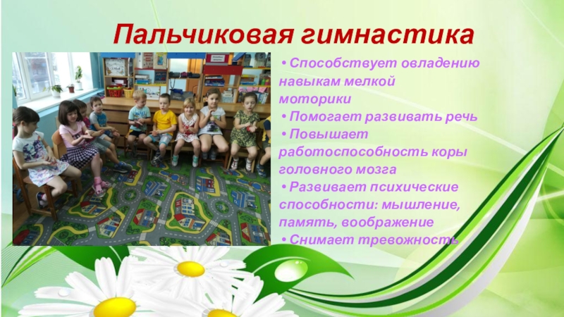 Пальчиковая гимнастикаСпособствует овладениюнавыкам мелкоймоторикиПомогает развивать речьПовышаетработоспособность корыголовного мозгаРазвивает психическиеспособности: мышление,память, воображениеСнимает тревожность