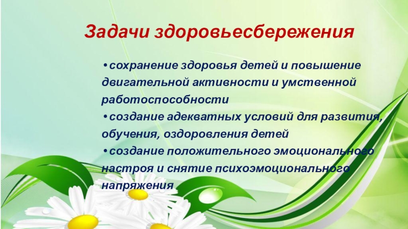 Задачи здоровьесбережениясохранение здоровья детей и повышениедвигательной активности и умственнойработоспособностисоздание адекватных условий для развития,обучения, оздоровления детейсоздание положительного эмоциональногонастроя