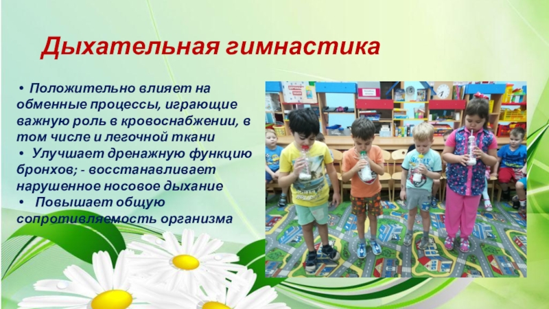 Дыхательная гимнастикаПоложительно влияет наобменные процессы, играющиеважную роль в кровоснабжении, втом числе и легочной тканиУлучшает дренажную функциюбронхов; -