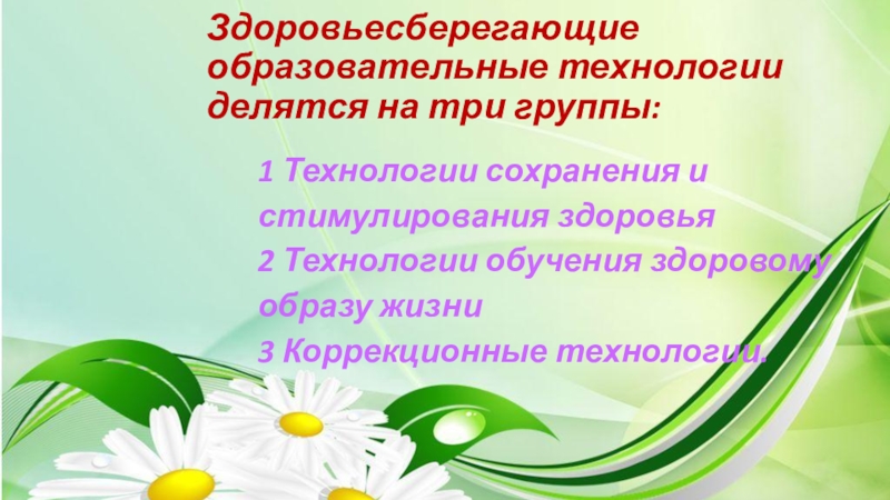 Слайд 6Здоровьесберегающие образовательные технологии делятся на три группы: